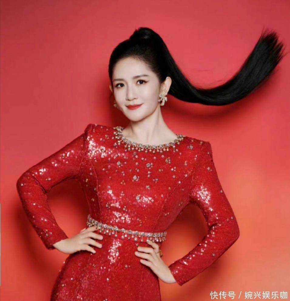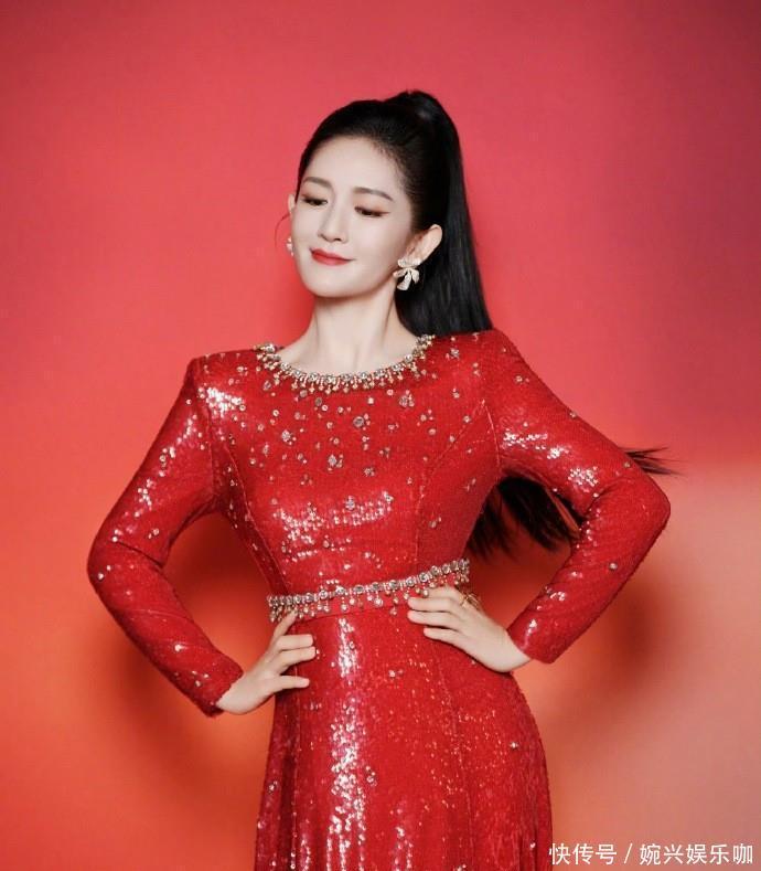 晚会上的她一身大红,透着一股喜庆的气息,高马尾配淡妆则显大气典雅,扮相满是“国泰民安”。